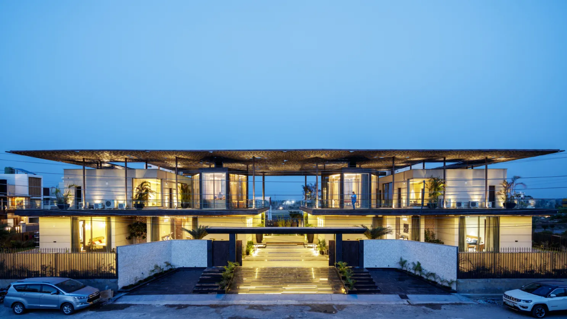 The canopy—which is crafted in digitally modelled, fibre-reinforced polymer set on an MS (mild steel) framework—is meant to replicate the experience of being in a rainforest, where filtered sunlight dapples through leaves. “We wanted to keep the roof as a very organic element,” says Rastogi, “so it doesn’t take away from the natural elements with which the house is built.” The canopy also serves the function of making all outdoor areas—including the swimming pool—accessible at all times, including during the harsher summer months. “Throughout the day, the shadow patterns keep changing and the same spaces have a different experiential quality,” he adds, “During the night, the dark colour blurs with the night sky.”